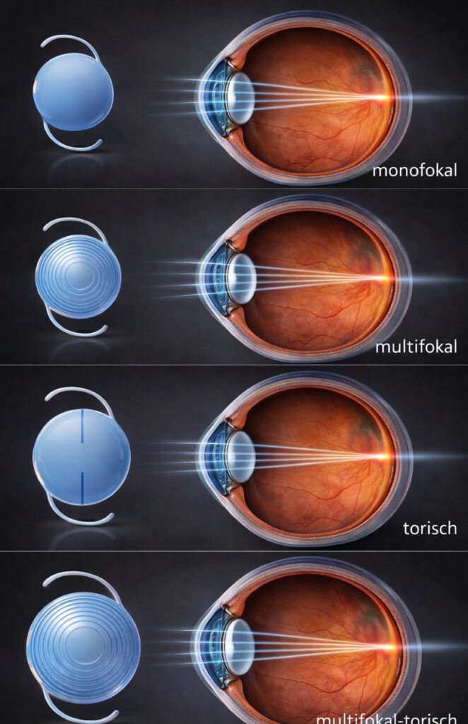 Heute gibt’s passende Linsen für jedes Sehbedürfnis: monofokal (ein Fokuspunkt) oder multifokal (mehrere), plus torische Varianten gegen Astigmatismus.
